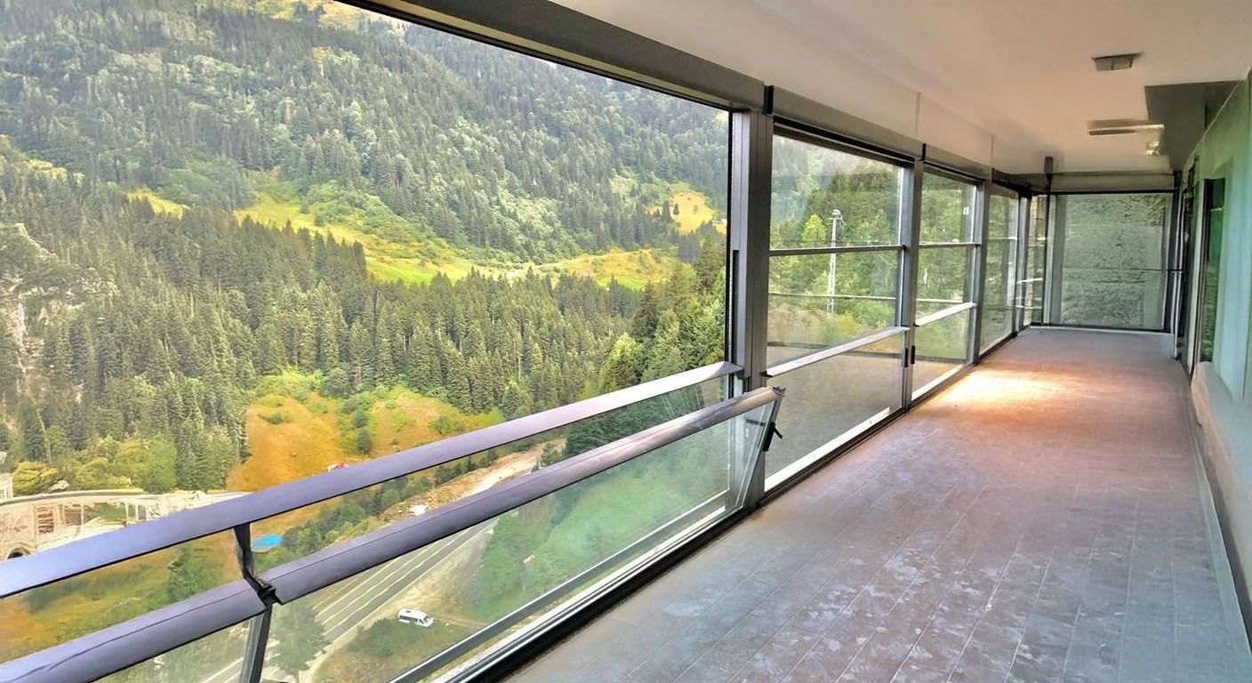 Cam balkon sistemleri, alüminyum raylar üzerinde hareket eden sürgülü veya katlanır cam paneller ile çalışır. Balkonları dört mevsim kullanılabilir hale getirir.